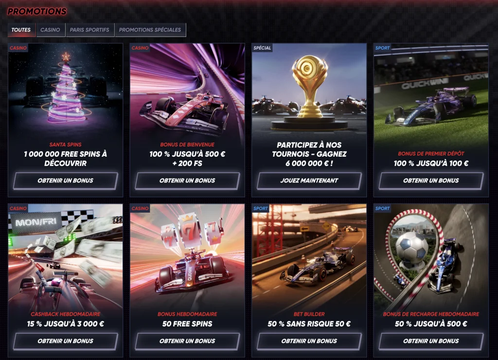En plus du bonus de bienvenue, Quick Win Casino propose une variété de promotions régulières pour maintenir l’engagement des joueurs. Les offres hebdomadaires incluent des bonus de recharge allant jusqu’à 50 % sur les dépôts effectués en milieu de semaine, ainsi que des tours gratuits sur des jeux populaires. Les joueurs peuvent également bénéficier d’un cashback hebdomadaire de 15 % (jusqu’à 3 000 €) sur les pertes nettes au casino, ou de 10 % (jusqu’à 200 €) pour les paris sportifs. Ces promotions sont particulièrement attrayantes pour les joueurs réguliers, car elles réduisent les risques tout en augmentant les opportunités de jeu.